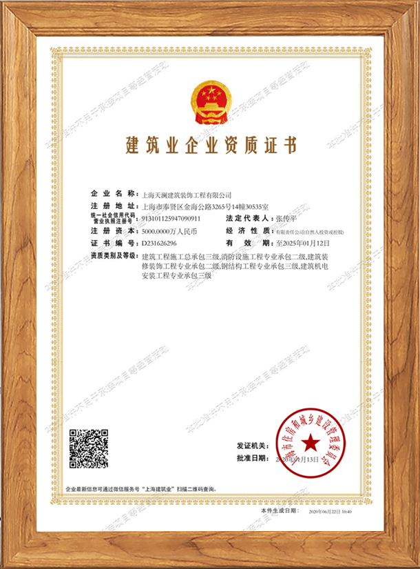 上海天瀾建筑裝飾工程有限公司由熱愛裝修事業(yè)的專業(yè)人士創(chuàng)辦,經(jīng)上海工商行政管理局注冊登記的專業(yè)上海工裝公司。天瀾建筑裝飾注冊資本5000萬,擁有建筑施工總承包三級,鋼結(jié)構(gòu)工程專業(yè)承包三級建筑裝飾工程專業(yè)承包二級,建筑機(jī)電設(shè)備安裝專業(yè)承包三級,消防設(shè)施工程專業(yè)承包二級等資質(zhì)。國家建筑裝飾裝修工程設(shè)計(jì)與施工二級資質(zhì)單位、上海市建筑裝飾裝修行業(yè)協(xié)會會員單位、有上海市建設(shè)和交通委員會頒發(fā)的“安全生產(chǎn)許可證”。