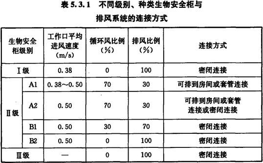 4 不同級別、種類生物安全柜與排風系統的連接方式應按表5.3.1選用。